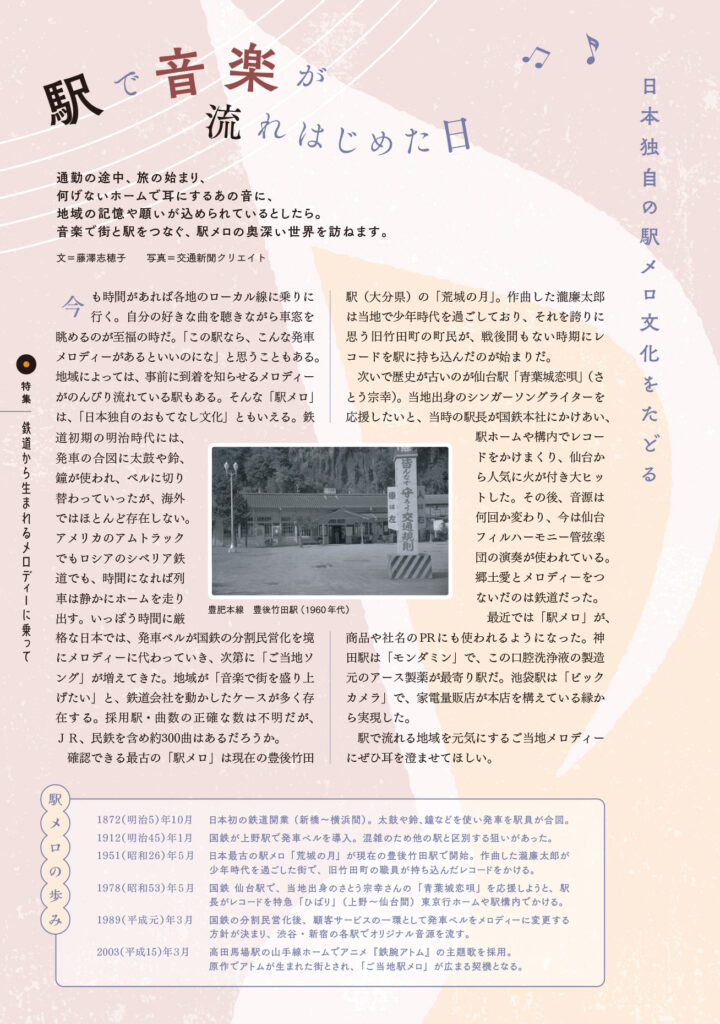 JR時刻表10月号の巻頭特集「鉄道から生まれるメロディーに乗って」に、「駅メロも聴こえてくるプレイリスト」「駅で音楽が流れ始めた日」の2本のエッセイを寄稿しました 2025年09月20日 update メディア JR時刻表10月号の巻頭特集「鉄道から生まれるメロディーに乗って」に、「駅メロも聴こえてくるプレイリスト」「駅で音楽が流れ始めた日」の2本のエッセイを寄稿しました。